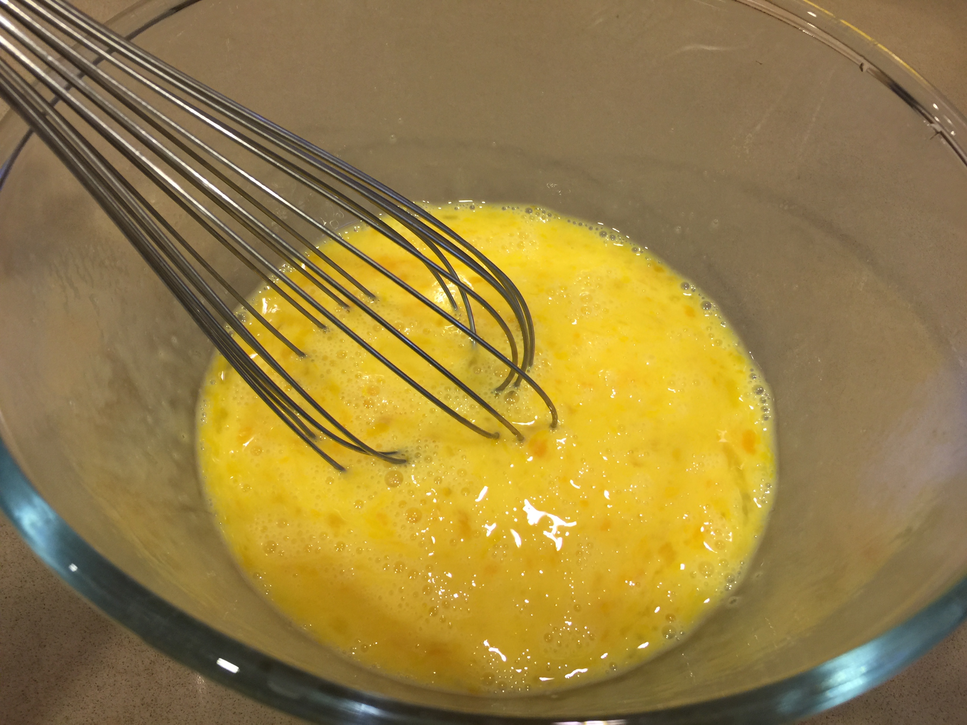 - 把鸡蛋打匀,备用。鸡蛋打到刚好混合就可以,就是还可以看到蛋白和蛋黄的纹路。我觉得这样煎出来的蛋饼口感比较好。