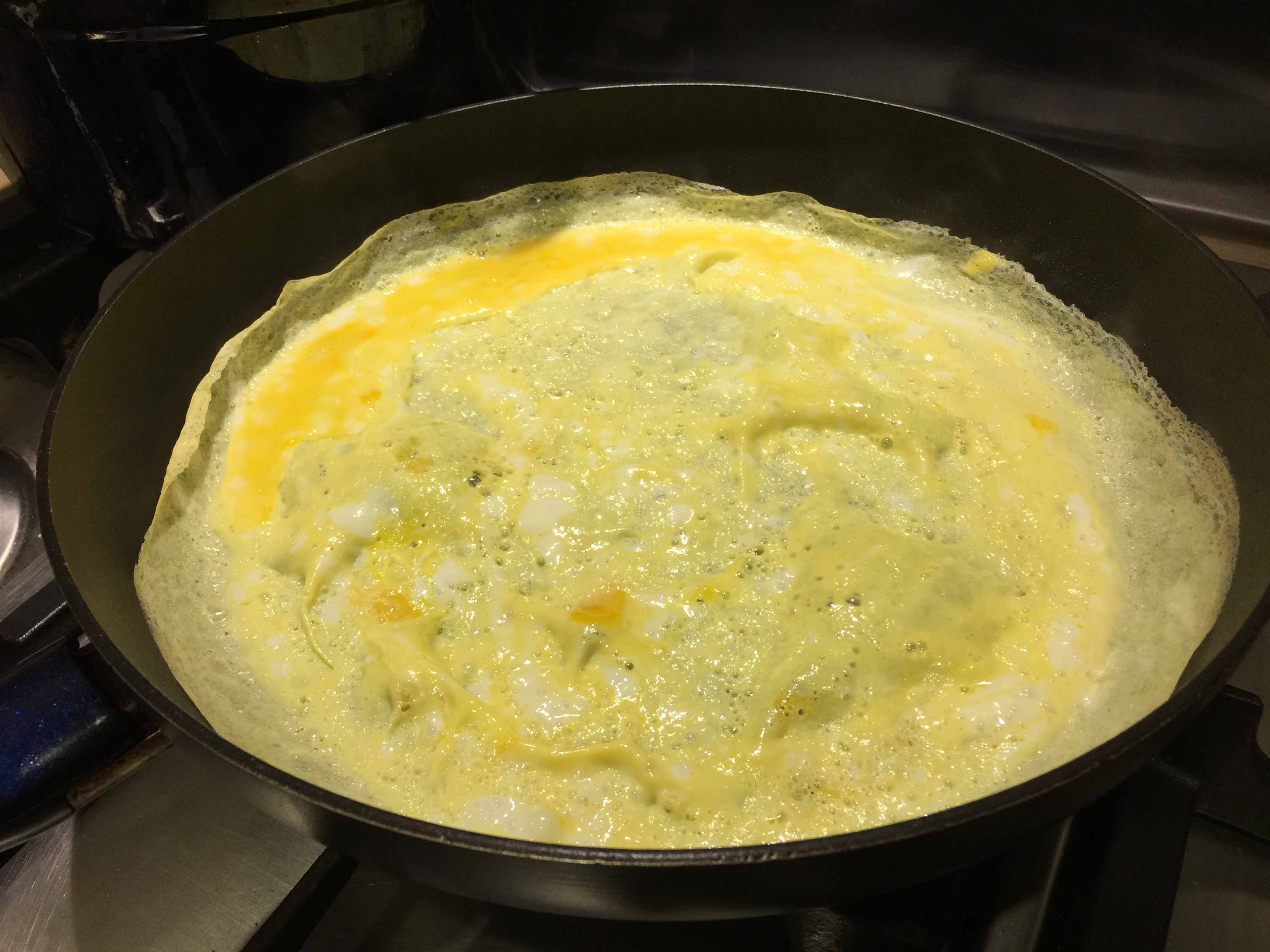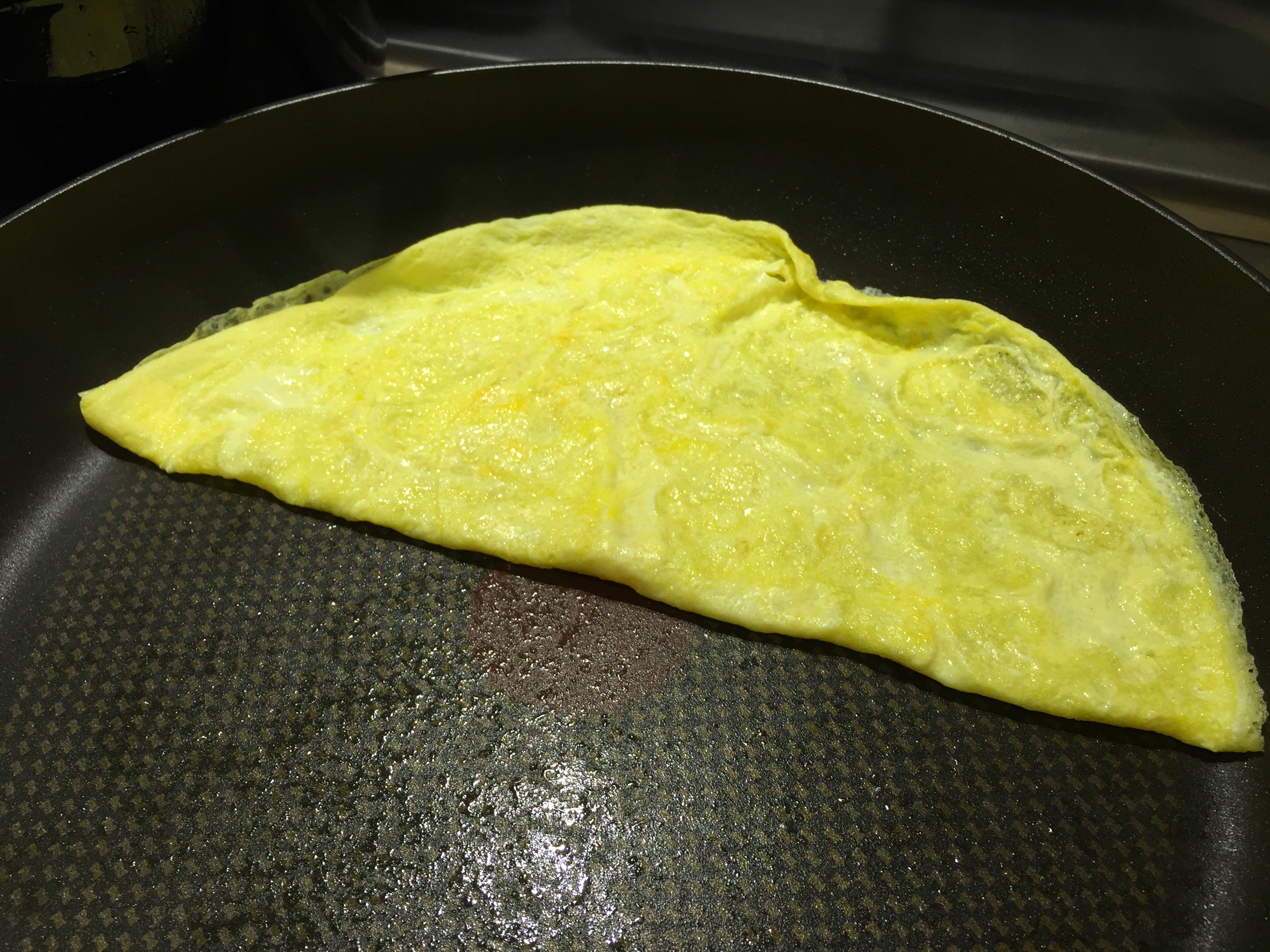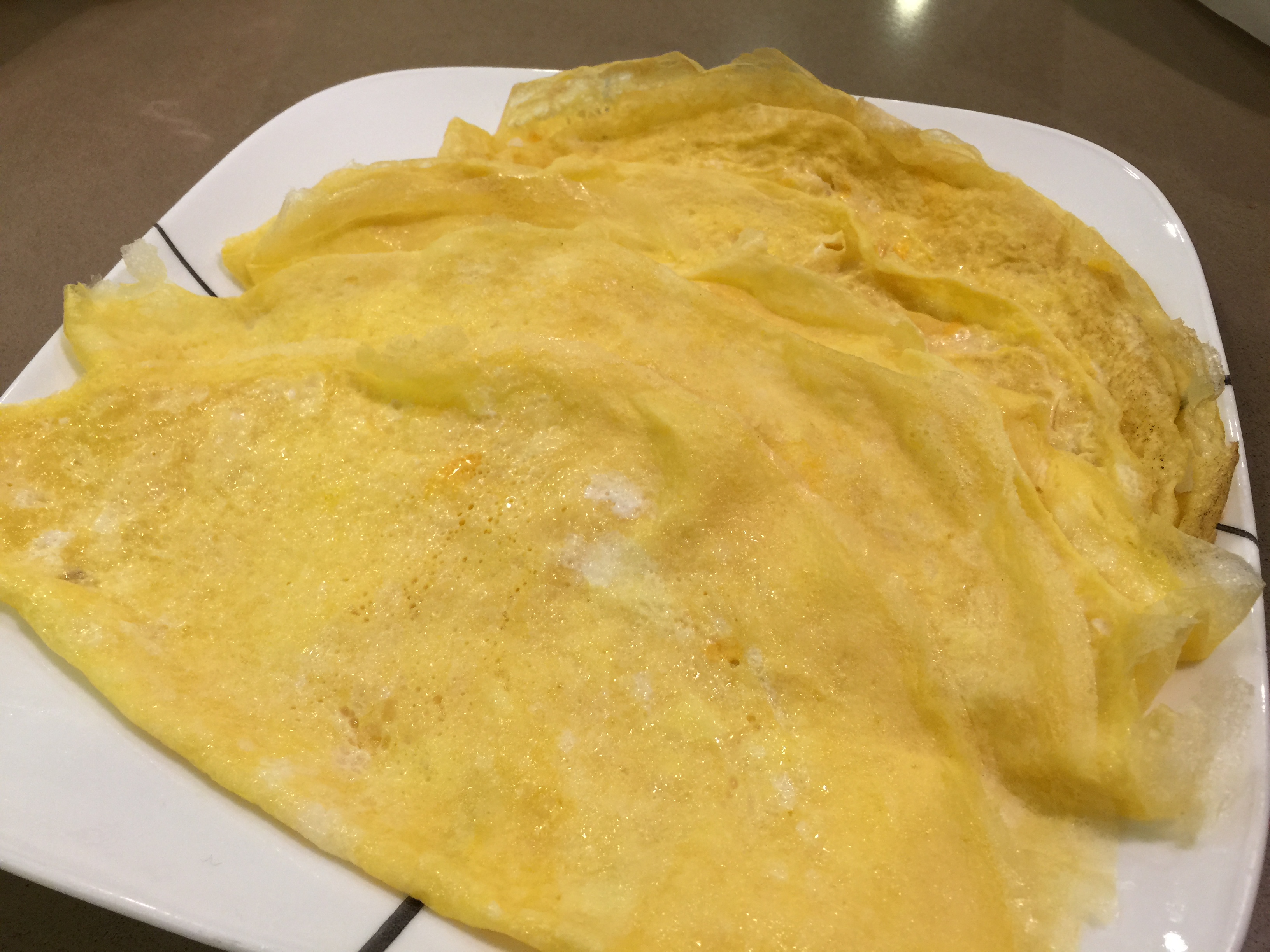 - 热锅,在不粘锅喷上薄薄的油,倒入适量蛋液,摊成薄薄一片,洒少量盐。煎至7成熟把蛋饼对折,上碟。