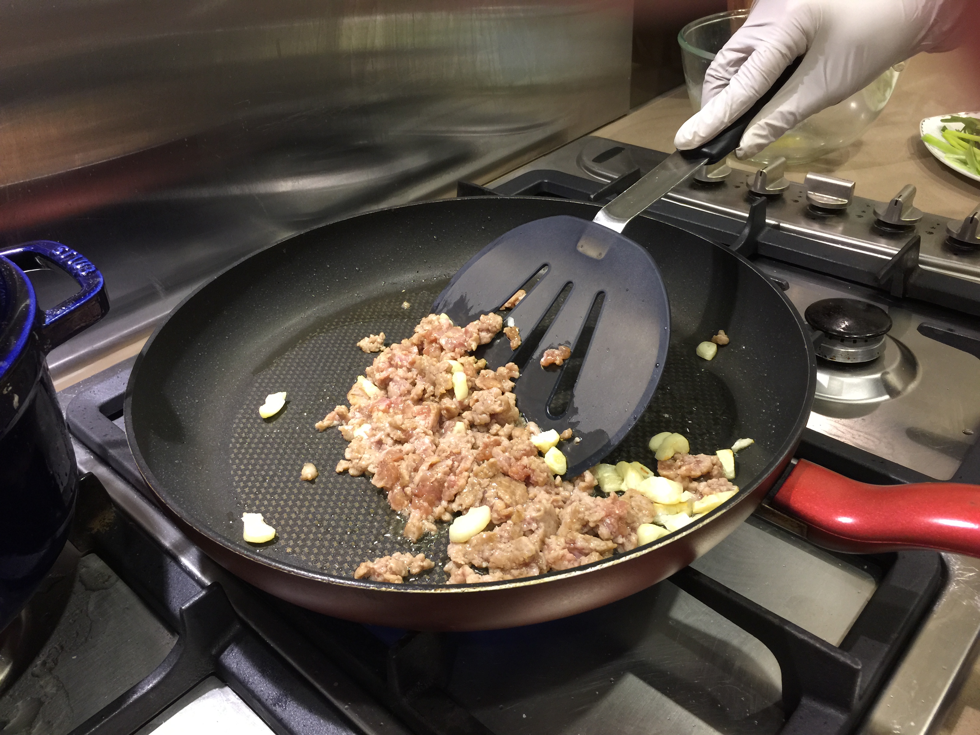 - 热锅,加少量油,下蒜头爆香。下腌好的猪肉碎,翻炒至9成熟。